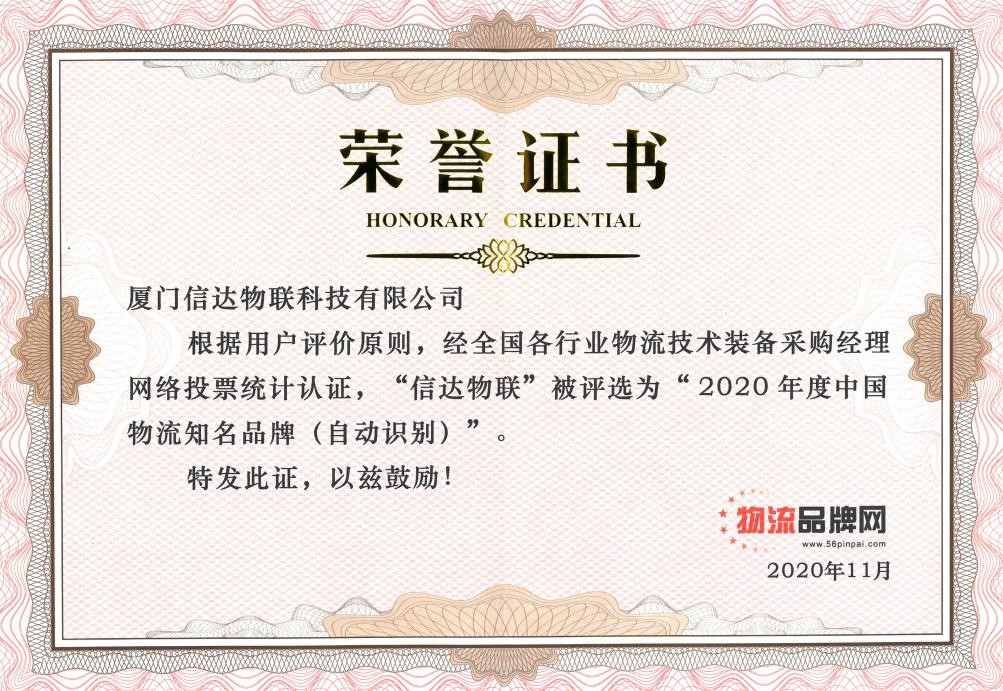 11月5日,2020物流知名品牌颁奖典礼于上海新国际博览中心召开,厦门信达物联科技有限公司(以下简称:“信达物联”)获“2020年度中国物流知名品牌(自动识别)”奖,这是信达物联连续三年获此殊荣。