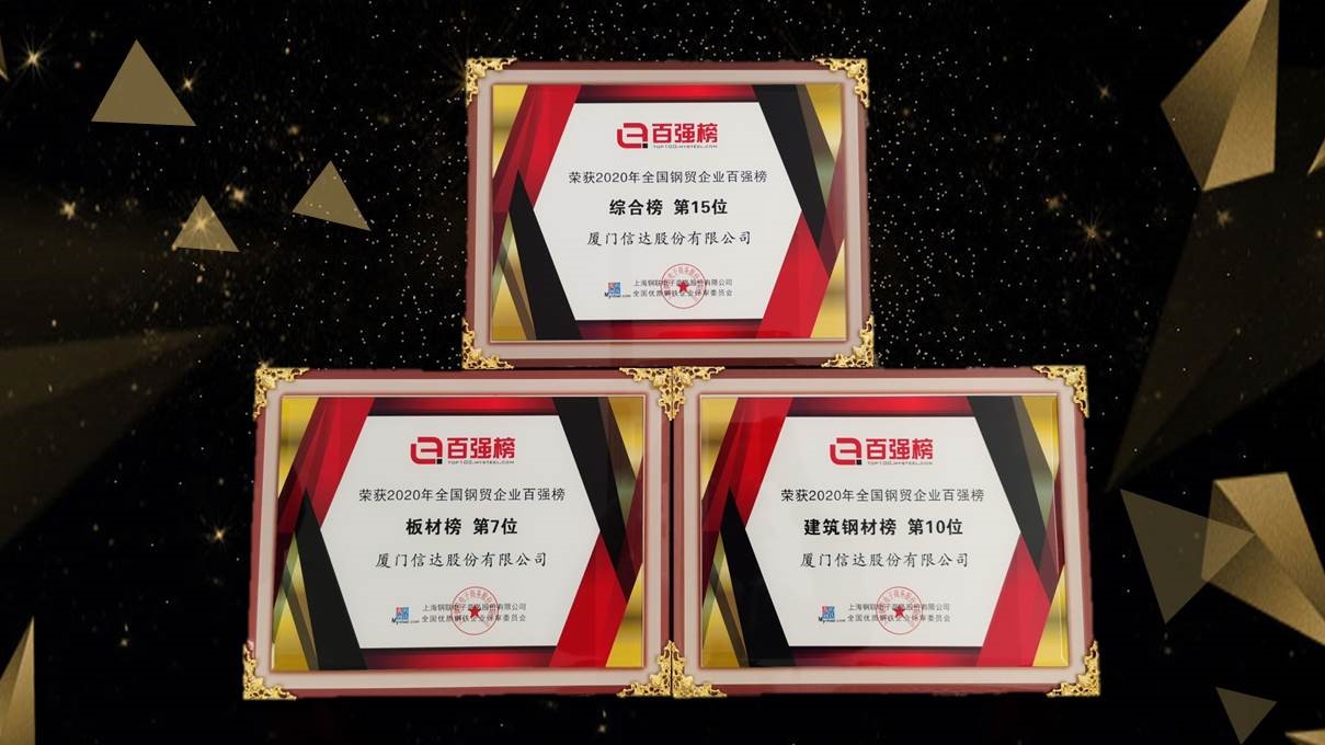 厦门信达凭借自身锐意进取、诚信经营,在钢铁行业内深耕多年,业务规模不断扩大,在本次会议上荣获“2020年度全国钢贸企业百强”综合榜第十五位,并位列板材榜和建筑钢材榜前十强。此项荣誉是业内对于厦门信达在钢铁领域专业实力的高度认可。