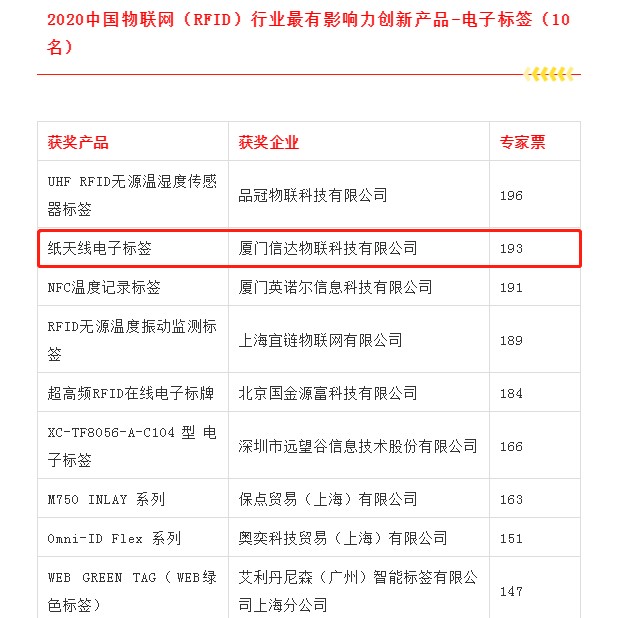 近期,物联网行业“奥斯卡”—2020物联之星中国物联网(RFID)行业年度评选,获奖名单正式出炉。