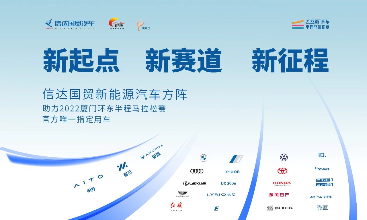 作为国内唯一的环湾马拉松专业赛道,环东海域浪漫线赛道按世界级标准建设,是全世界第一条“全路权”的高级别马拉松赛道,新赛道为参赛选手提供了无与伦比的新体验。早在十年前,信达国贸汽车旗下厦门信达通宝就开启了与厦门马拉松的强强联合,创造了连续八年宝马作为唯一指定用车的佳话。今天,在这条最美赛道,信达国贸汽车再次携手马拉松,并以全新的新能源方阵助力新赛道、新赛事。在这个方阵中,既有代表造车新势力的AITO、智己、极狐,也有来自豪华汽车品牌阵营的宝马i、奥迪e-tron、凯迪拉克锐歌、红旗E-HS等新能源汽车系列,主流合资品牌的大众ID.、丰田bZ4X、日产ARIYA、本田e:NS1、别克微蓝等也悉数登场。作为唯一官方指定用车赞助商,信达国贸汽车充分理解环保办赛的理念,携手主办方以“节能环保”为宗旨,身体力行地打造“零排放”的厦门新赛道。